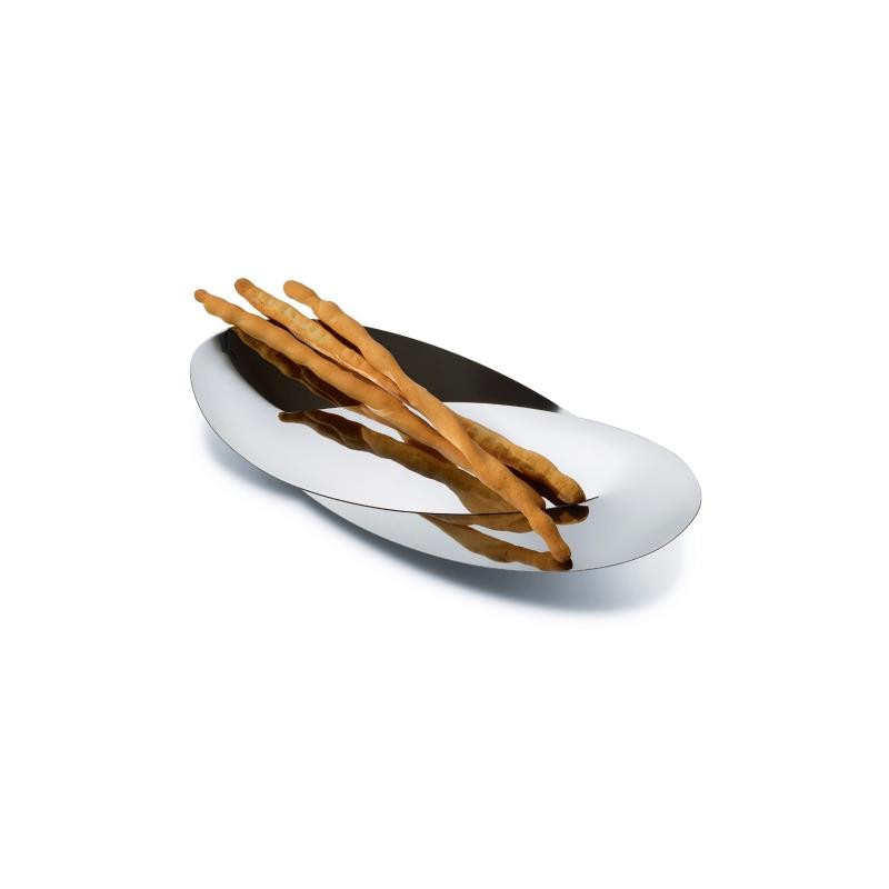 ALESSI OCTAVE “Octave” by Abi Alice is produced simply by cutting, bending and welding specific areas of an 18/10 stainless steel sheet and the result is an elegant container for the table suitable for serving bread or breadsticks. The polished finishing enhances the sophisticated simplicity of the object. code: ABI05 height: 4.5 cm length: 41.5 cm width: 17.5 cm