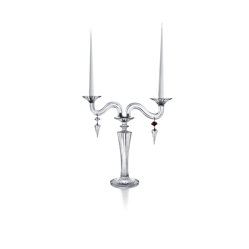 the mille nuits candelabrum, with its baroque spirit, captures the full charm of the orient. its slanted-cut arms, adorned with two ornamental crystal curls, shine with elegance. each arm is decorated with arrowhead-shaped pendants that brilliantly capture and reflect light. the candles are placed in crystal holders shaped like blooming daffodils. this luxurious mille nuits candelabrum is available in two, three, or five-light versions, and also with a gold finish. the windshields, sold separately, enhance every flicker of the flame, amplifying its glow. designed by mathias for baccarat, the mille nuits collection is inspired by the tales of "one thousand and one nights" and also includes chandeliers, stemware, and home décor items.