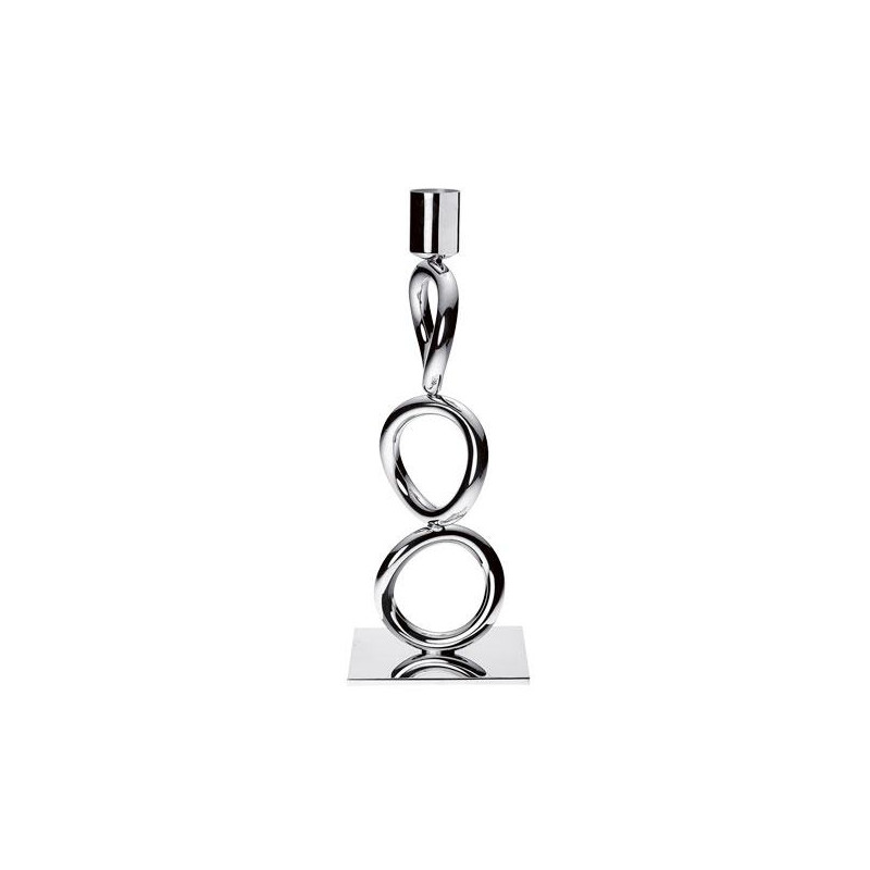 Christofle Vertigo Silver Plated Three-Ring Candlestick The silver plated Vertigo triple-ring candlestick, which holds a single taper candle adds modern and playful elegance to any room. Also comes in shorter and taller multiple-ring versions. Vertigo’s bold motif — a subtly asymmetrical, thick ring often placed playfully askew — can be found on every piece in the collection designed by Andrée Putman. Vertigo features a strong emblem: a Ring, whose sensual & subtly asymmetric design is found on every Piece. MATERIAL • Silver Plated DIMENSIONS • Height: 23 cm