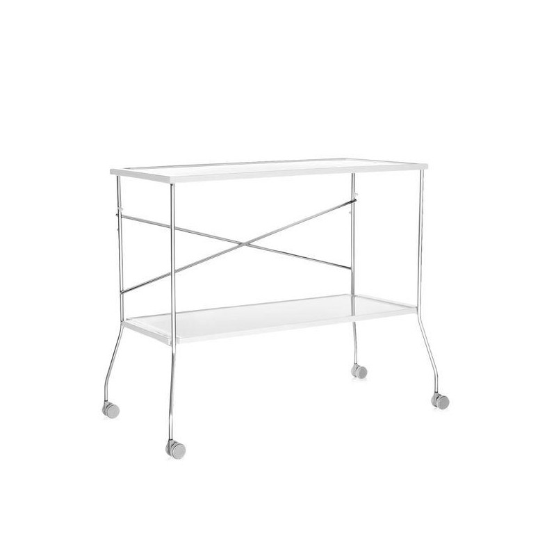 Kartell Trolley Flip white by Antonio Citterio with Toan Nguyen Kartell brings transparency also in the world of carts: Flip is born, a folding trolley that combines the transparent plastic material of the floors with the metal of the structure. The independent surfaces are in polymethylmethacrylate, with a lenticular shape, an extreme synthesis of functionality and aesthetic research. Flip can be used as a trolley, ideal for aperitifs and buffets, but also as a practical sofa-side table; it folds and, once closed, takes up minimal space and can be stored very easily. Material Structure: Chromed steel Floor: PMMA dimensions Width: 80 cm Depth: 42 cm Height: 72 cm Unit weight: 10.4 kg
