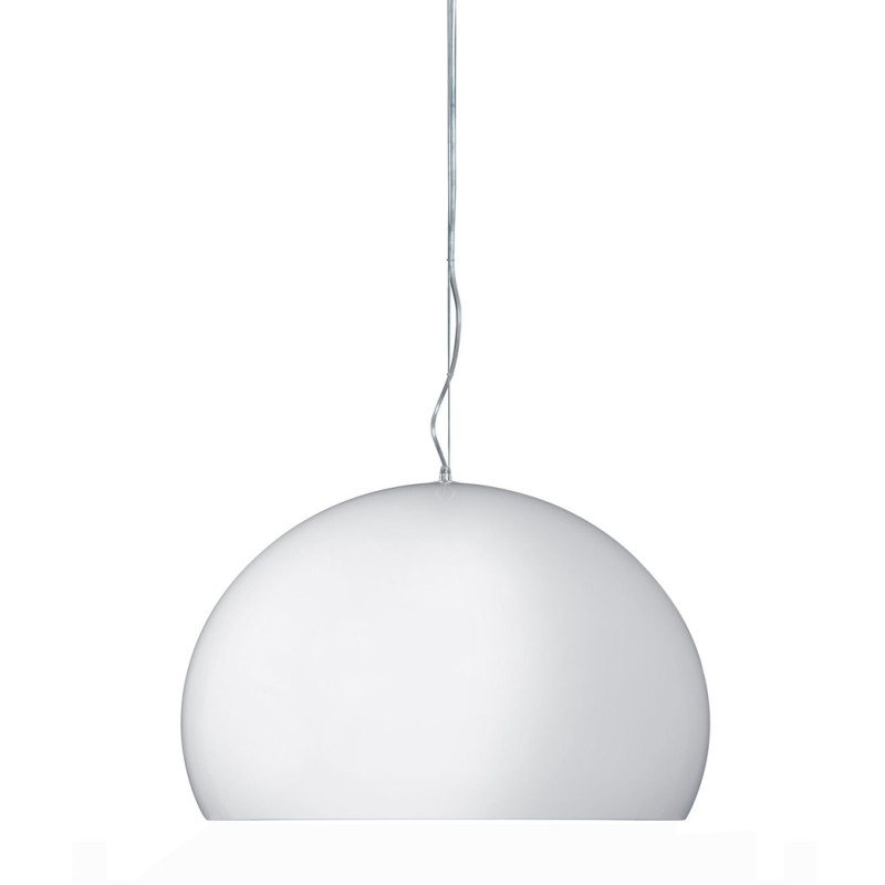 FL/Y is a suspension lamp with essential lines. The particular transparency of the material and the brightness of the colors evoke the idea of a soap bubble, changing with the reflections of light. The dome is not perfectly hemispherical, but the secant plane is below the diameter height to better collect the light. Available in three different sizes: Fl/Y (diameter 52 cm, diffuser height 33 cm), Small Fl/Y (diameter 38 cm, diffuser height 28 cm), and Big Fl/Y (diameter 83 cm, diffuser height 55 cm).