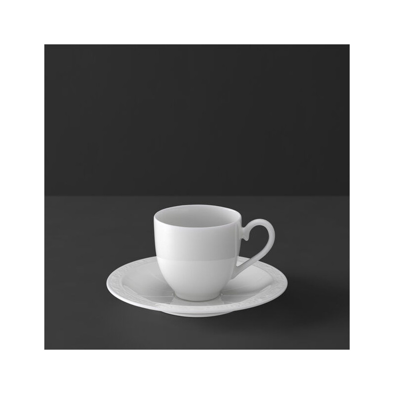 Coffee cup with saucer Collection: White Pearl Material: Bone Premium china Dishwasher safe Microwave safe Codes: 1043891420 + 1043891430