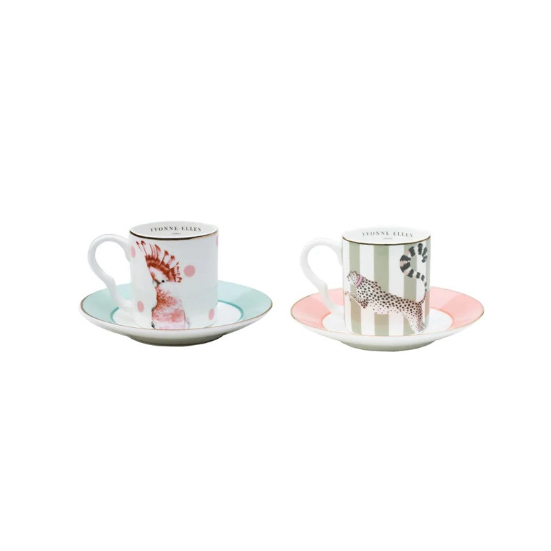 SET OF 2 COFFEE CUPS WITH SAUCERS, CHEETAH AND PARROT A22004016 - YVONNE ELLEN This Yvonne Ellen set includes two coffee cups with saucers, each featuring hand-drawn designs of a cheetah and a parrot. Perfect for enjoying your morning espresso, both cups have pastel-colored designs and come in a box package. These cups are made from fine bone china/porcelain and should be hand washed only. It should be noted that they are not suitable for use in the microwave or dishwasher.