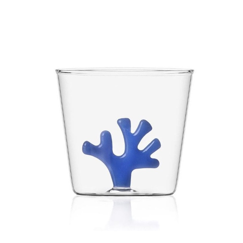 CORAL REEF GLASS, CORAL REEF - ICHENDORF MILANO Coral Reef, designed by designer Alessandra Baldereschi for Ichendorf, is a collection of glasses inspired by the marine world, creating a captivating and refined set. The coral tumbler, perfect for serving water and other beverages, features a small colorful coral branch positioned at the bottom of the glass. Material: Borosilicate Glass Size: H 8 x D 8.5 cm Reference: 09352048