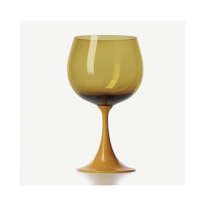 The Burgundy Glass 03 BG Burlesque, in the sunflower-brown color combination, is handcrafted by the master artisans at NasonMoretti. This glass is created using molds where molten glass, prepared following ancient recipes dating back to the factory's founding, is blown by hand, representing a perfect fusion of tradition and craftsmanship. cm H x Ø: 21x10,2
