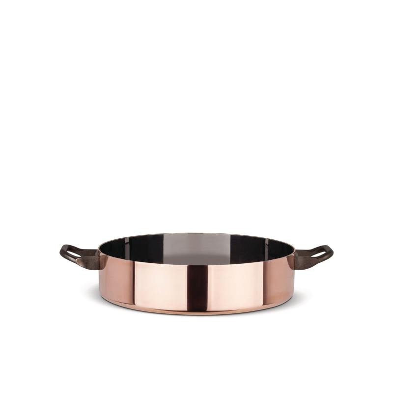 Low two-handled casserole made of bilaminate of thick copper plate, ensuring perfect heat conduction, encased in a thin layer of stainless steel that ensures maximum hygiene and facilitates cleaning. Height: 6 cm Diameter: 24 cm Capacity: 270 cl Code: 90102/24 *Last item left, displayed in the shop"