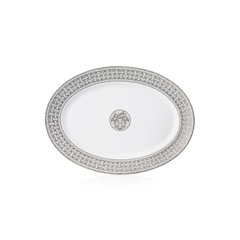 Hermes Mosaique au 24 Platinium Large Oval Platter Large Oval platter in porcelain In homage to the mosaic which covers the floor of 24 Faubourg Saint-Honoré, the historic Hermès store, the geometric friezes in matte grey tones, enhanced with platinum, play with the light. Dimensions: 42 cm Code: 35050P For all Hermès products that are not available at the time of purchase, please consider a delivery time of 6 to over 12 months