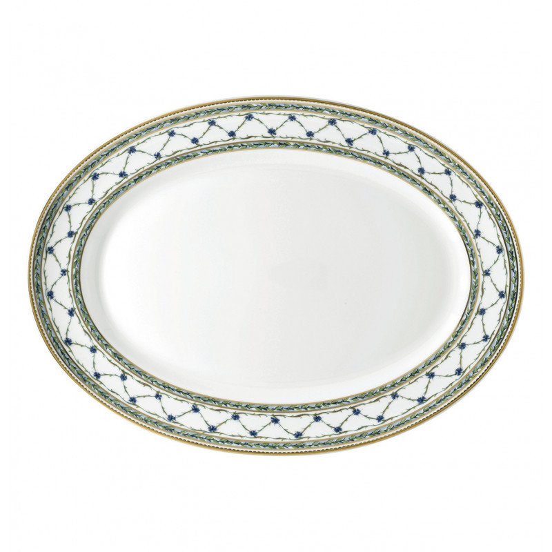 The “Allée du Roy” is one of Raynaud's classic collections, inspired by the French 18th century, which saw the creation of myriad china designs dedicated to the King and his court. A trellis entwined with leaves and cornflowers between crowns of laurels features on all pieces of the service in shades of blue and green. Material: Limoges Porcelain Oval tray Dimensions : 41 cm