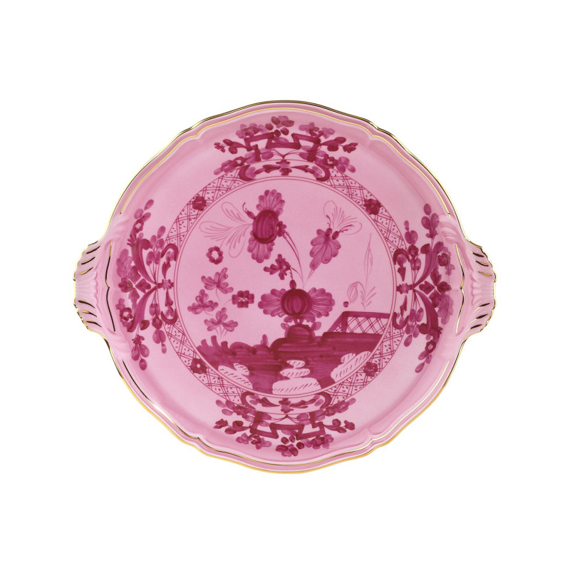 The cake plate from the Oriente Italiano collection by Ginori 1735, crafted in fine porcelain, is adorned with the bold tones of malachite green and the distinctive "carnation" floral pattern. This collection masterfully combines traditional craftsmanship with contemporary aesthetics, evoking refined oriental atmospheres through intricate design details and color nuances, enhanced by a precious gold trim.
