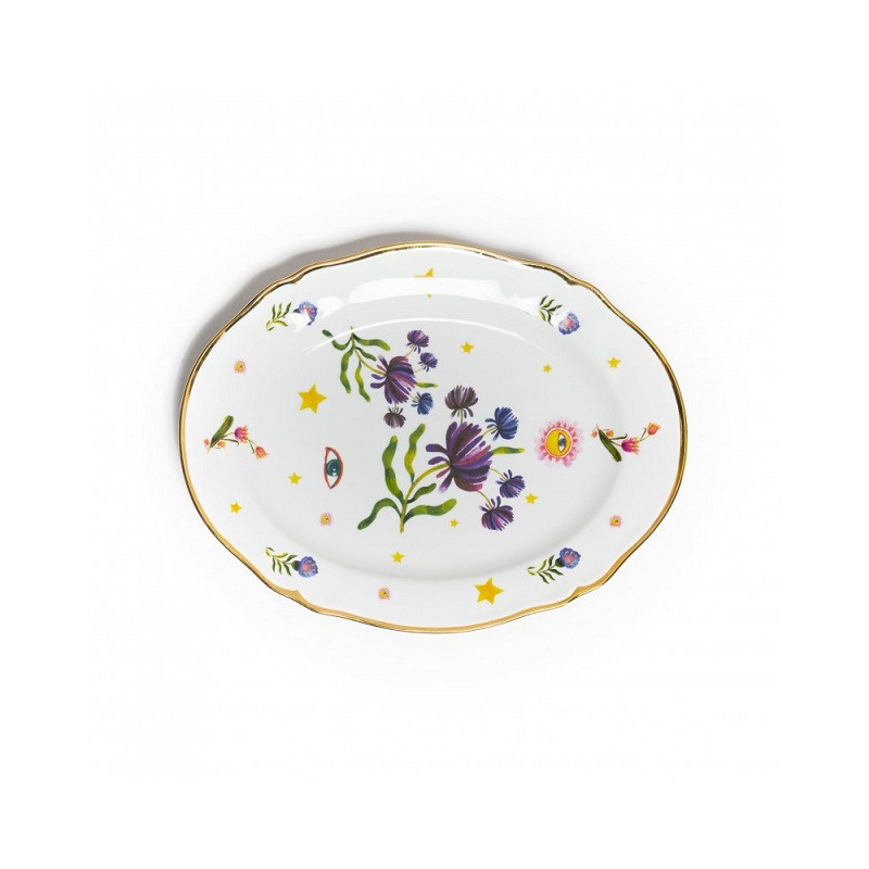 Serve your best dishes on this beautiful tray of bitossi in its floral decoration, so you can enrich your table at its best! OVAL TRAY 34 CM FLORAL DECORATION WITH GOLD THREAD FTB93 - BITOSSI HOME