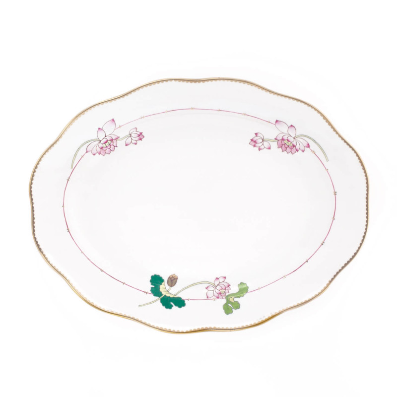 Oval tray 36,5 x 27,5 cm Material: fine china with gold decorations Code: 20102 Hand wash recommended Never microwave an item with gold or platinum trim.