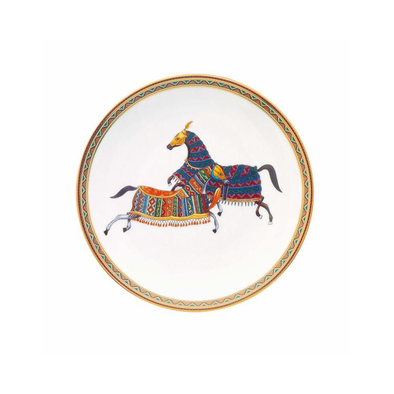 Hermes Cheval D'Orient Bread & Butter Plate n°1 Code: 9812P Joyful horses enjoy their freedom, galloping across the steppe and climbing wooded hills. Resplendent in their gleaming, brightly coloured caparisons, they seem to have only just escaped from a Persian legend. The accompanying floral and multicolour stripe patterns dotted with gold evoke the Silk Road and Eastern hospitality. Dimensions: 17 cm Material: porcelain For all Hermès products that are not available at the time of purchase, please consider a delivery time of 6 to over 12 months