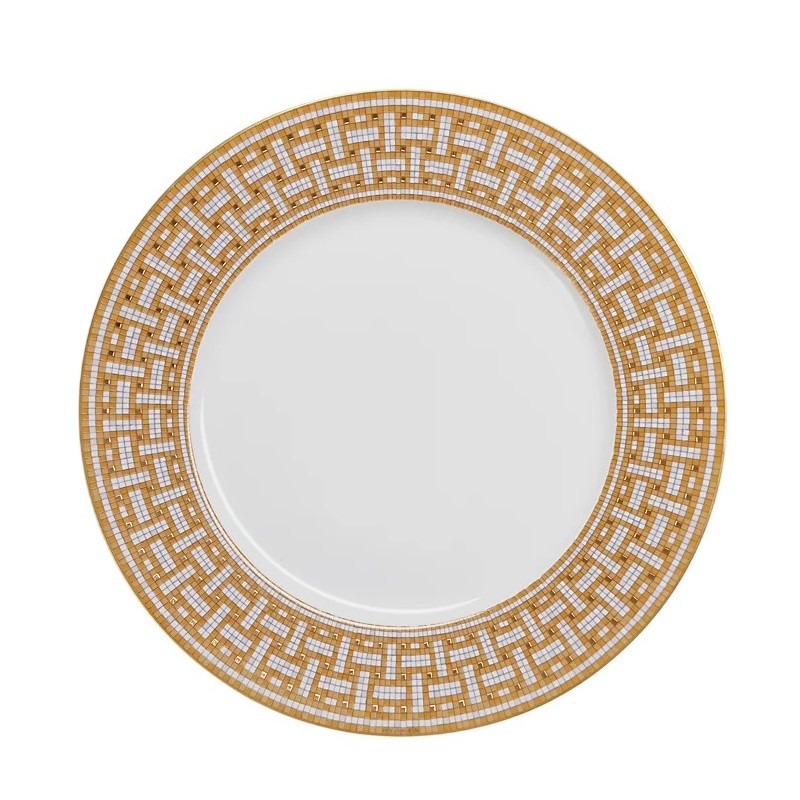 Timeless elegance defines this dinner plate from the Mosaïque au 24 collection. Crafted from fine porcelain with silk-screened and hand-applied decorations, it celebrates the aesthetic codes of the historic Hermès boutique at rue du Faubourg-Saint-Honoré in Paris. This monochrome interpretation in shades of gray is elevated by the brilliance of platinum, evoking the Art Deco mosaics that adorn the Maison's boutique.