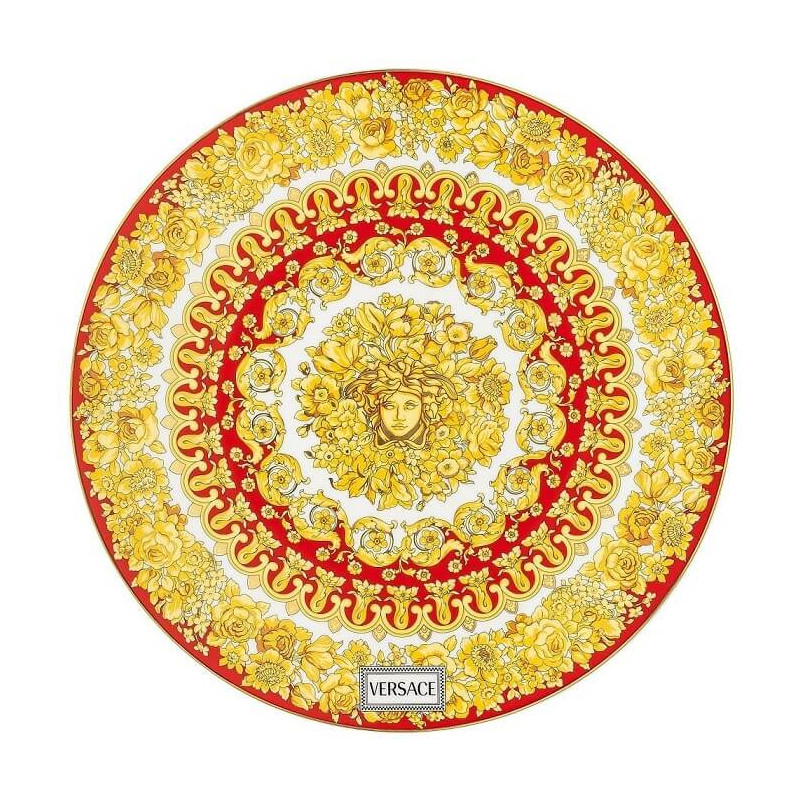 A rhapsody of color and detail. One with the ready-to-wear collection, the dinnerware and clothing draw inspiration from each other – resulting in a remarkably modern, yet intrinsically Versace collection. The Medusa and baroque flowers are painted in opulent golden shades, while key items feature the Versace 90s Vintage logo label. Material: porcelain Diameter: 33 cm