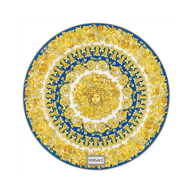 A rhapsody of color and detail. One with the ready-to-wear collection, the dinnerware and clothing draw inspiration from each other – resulting in a remarkably modern, yet intrinsically Versace collection. The Medusa and baroque flowers are painted in opulent golden shades, while key items feature the Versace 90s Vintage logo label. Material: porcelain Diameter: 33 cm