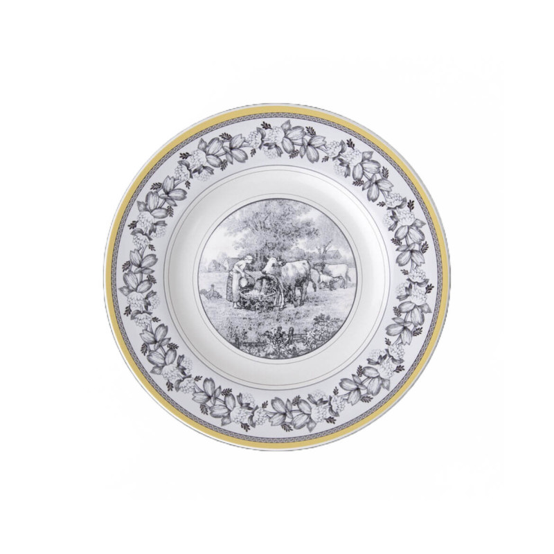 21 CM DESSERT PLATE, AUDUN FERM 10-1067-2640 - VILLEROY & BOCH The Audun collection features exquisite decorations inspired by copper engravings depicting detailed landscapes, along with delicate floral designs in elegant shades of yellow and gray. By using Premium Porcelain, you can create a table with a classic and rustic charm. The Audun placeholder plate, with its timeless design, adds a special touch to every table and can also be used as a plate for cakes and pies. Experience the enjoyment of dining in style every day. SKU: 1010672640 Diameter: 21 cm DISCOVER THE COLLECTION: Audun - Villeroy & Boch