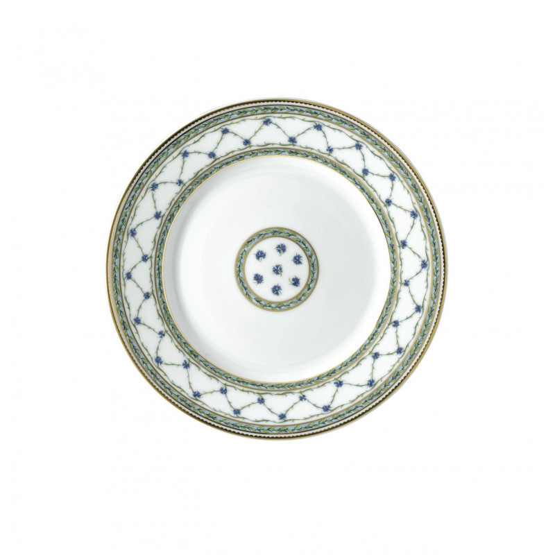 The “Allée du Roy” is one of Raynaud's classic collections, inspired by the French 18th century, which saw the creation of myriad china designs dedicated to the King and his court. A trellis entwined with leaves and cornflowers between crowns of laurels features on all pieces of the service in shades of blue and green. Material: Limoges Porcelain Flat plate Dimensions: 22 cm