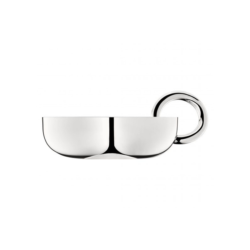 The small silver-plated Vertigo bangle bowl with a single handle is perfect for serving snacks such as nuts, olives, or candy, and it can also be used as a trinket catchall. The distinctive Vertigo motif—a subtly asymmetrical, thick ring often playfully askew—graces every piece in this collection designed by Andrée Putman. This elegant yet contemporary piece is ideal for aperitif occasions, bringing a touch of sophistication to any setting.