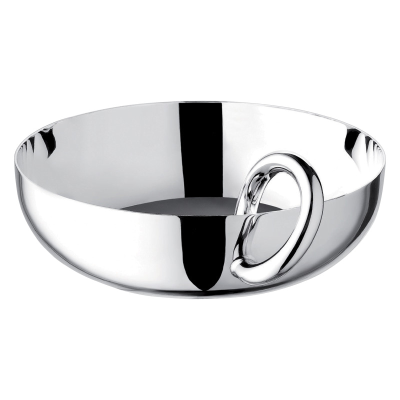The medium silver plated Vertigo bangle bowl with single handle is perfect for serving snacks like nuts, olives or candy or could be used as a trinket catchall. Vertigo’s bold motif — a subtly asymmetrical, thick ring often placed playfully askew — can be found on every piece in the collection designed by Andrée Putman. Diameter : 14 cm