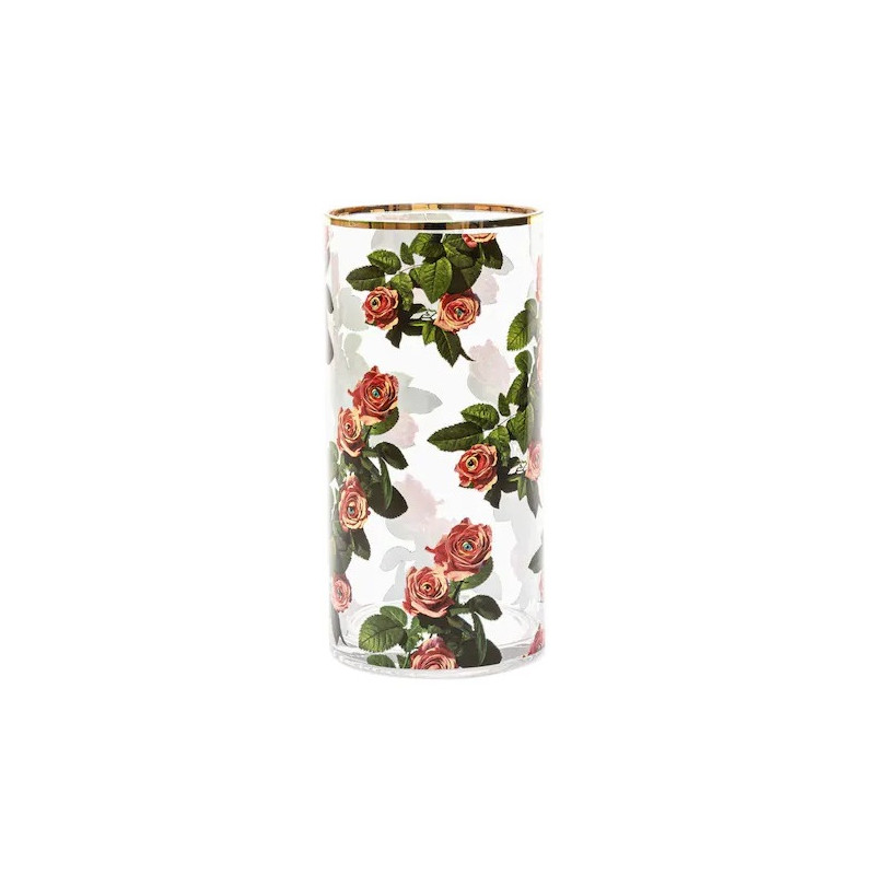 VASE, ROSES, 30 CM, GLASS, 14173 - SELETTI This vase, realised in glass, was born from an idea by Maurizio Cattelan & Pierpaolo Ferrari with the Toiletpaper Home studio. It's decorated with roses and a gold finish on the rim. The roses vase will be perfect in every room of your home. Material: Glass Made in: China Designer: Toiletpaper Codice Colore: Multicolor Dimensions: L 30 cm x H 15 cm