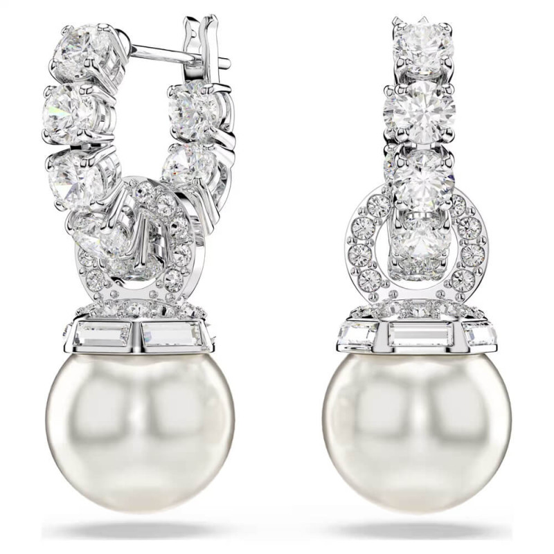 Enhance your elegance with the Matrix Crystal Pearl drop earrings by Swarovski. These exquisite rhodium-plated earrings feature Tennis hoops and connecting rings adorned with a sparkling pavé, while Swarovski Crystal Pearls add a classic touch of sophistication. Perfect for any occasion, they reinterpret timeless design with modern versatility and charm.