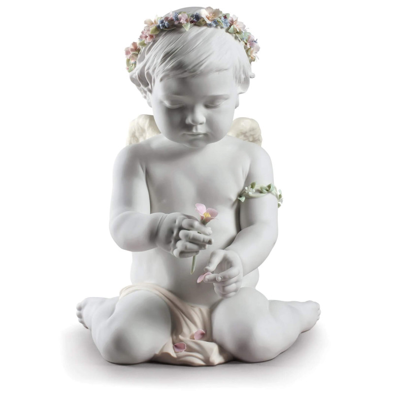 CHERUB OF OUR LOVE ANGEL FIGURINE, LLADRO Limited edition matte white porcelain figurine of an Angel decorated with soft tone enamels, featuring a bracelet and a garland composed of 19 flowers and 55 leaves. Dimensions: H 36 cm x W 28 cm x D 32 cm Sculptor: Ernest Massuet Limited edition units: 1500 SKU 1009117