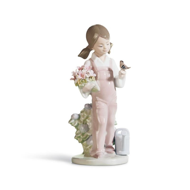 Cute porcelain statue of a girl with a pink bib carrying a bunch of flowers in one hand and a little bird in the other.