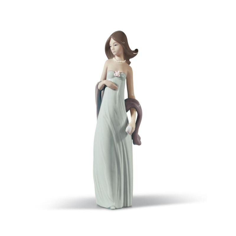Refined porcelain statue representing a young woman with a long green dress and a pearl necklace around her neck.