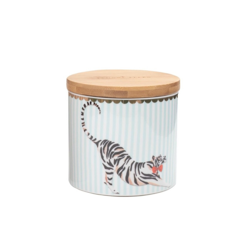 0.5 LITER JAR, TIGER A22009006 - YVONNE ELLEN Add Yvonne Ellen's porcelain jars to your kitchen for an elegant space management solution! The bamboo lid fits perfectly to the jar, making the container airtight and suitable for storing dry food, coffee, tea, or sugar. With Yvonne Ellen's iconic tiger illustration, this jar deserves a featured spot on your countertop! Made of porcelain, it has a fabulous touch sensation. Size: H 9.5 x Ø 10 cm.