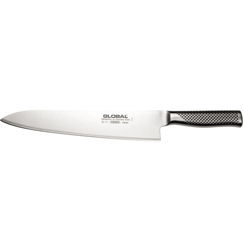 The G-17 is the longest chef’s knife in Global’s G Series: a powerful 27 cm blade built for professional chefs who require precision and efficiency when preparing large quantities. Its long, sleek blade is perfect for slicing through large cuts of meat, big vegetables, or prepping in high-volume kitchens.