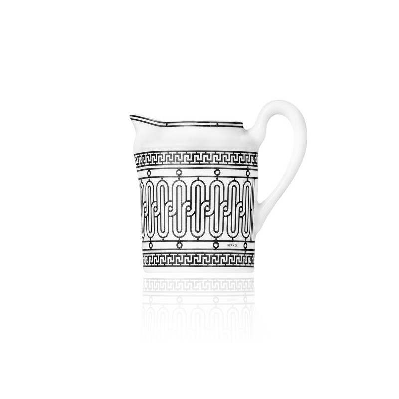 Hermes H Deco Creamer The Art Deco wrought-iron friezes which adorn the Hermes 24 Faubourg and rue de Sevres stores, inspired H Deco. This very Parisian service is stamped with the initials HH, around which an intricate black and white decoration spirals. Capacity: 15 cl Code: 37021P For all Hermès products that are not available at the time of purchase, please consider a delivery time of 6 to over 12 months