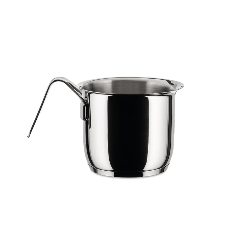Milk boiler in 18/10 stainless steel mirror polished. Suitable for cooking with induction, gas, electric hob, ceramic glass hotplate and in the oven. Dishwasher safe. Height: 13 cm Diameter: 14 cm Capacity: 190 cl Code: AJM302