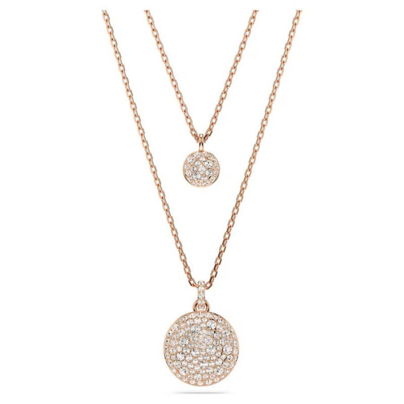 The design features two chains, each with a domed meteor motif that is beautifully adorned with a snow pavé of clear round crystals in different sizes. For extra versatility, the pendant can be reversed, revealing a halo of crystals around the larger motif, and a single crystal at the center of the smaller motif. Collection: Meteora Length (minimum - maximum): 38 - 45 cm Motif size: 2.2 x 1.6 cm Material: Crystals, Rose gold-tone / rose gold-tone / rhodium plated Color: White Clasp type: Lobster.