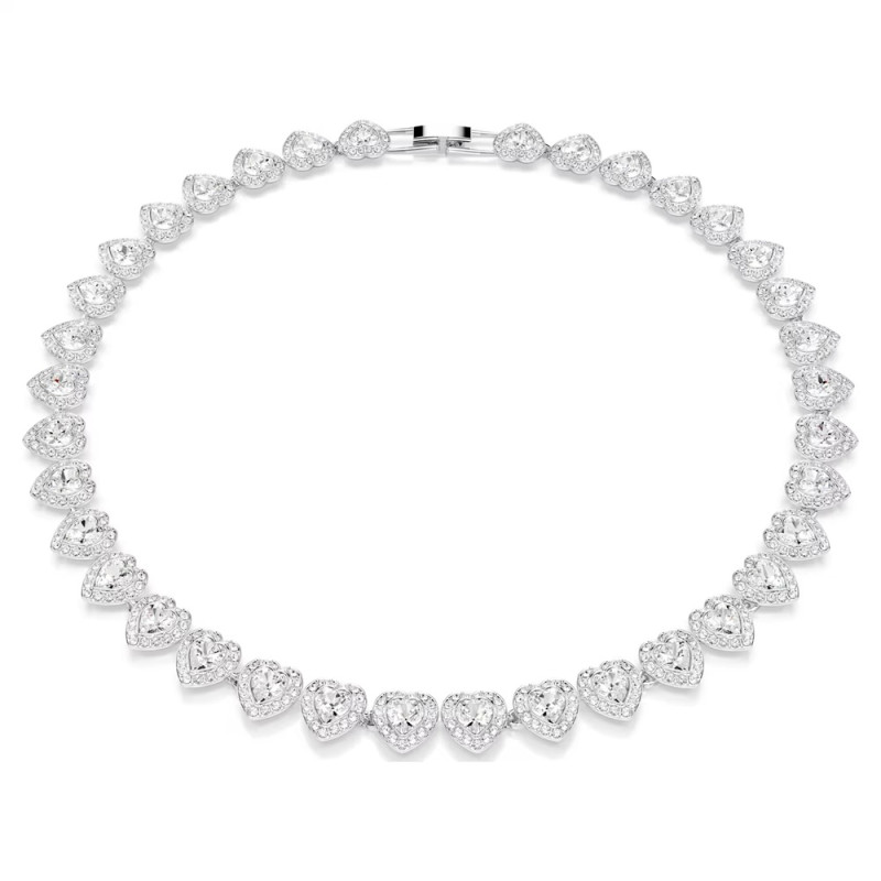 A refined piece that expresses love and radiance with a timeless style. The rhodium-plated design features a full circle of heart-shaped crystals, each framed by a brilliant pavé for an extraordinary light effect. Perfect for adding a romantic and sophisticated touch to any look, this necklace pairs beautifully with matching jewelry for unparalleled elegance.