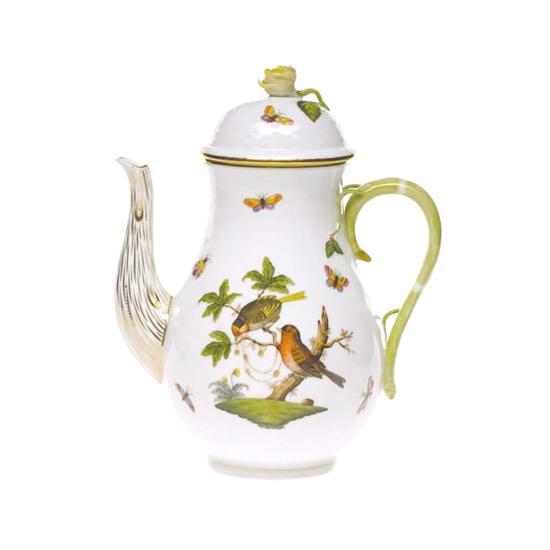 Rothschild Birds, one of the Best Known Herend pattern, takes its name from the important baronial Rothschild family. The RO main elements are two Bird with a Golden Necklace (there are twelve variants of the couple of birds). This pattern is ispired to a 19th century tale about Baroness Rothschild, who lost her pearl necklace in the garden of her viennese residence. Several days later it was found by her gardener, who saw some birds playing with it in a tree. Coffee pot with lid, h 25 cm, l 20 cm Material: fine china with gold decorations Code: 1611 Hand wash recommended Never microwave an item with gold or platinum trim.