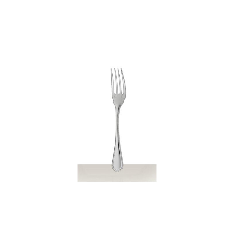 Christofle Spatour Silver Plated Fish Fork The silver plated fish fork in the Spatours pattern can be used in conjunction with a fish knife to easily separate meat from fish bones. Reflective of its 19th century roots, the Spatours collection, which was available in the first Christofle catalogue in 1862, features generous curves, decorative heels and a slender rounded ridge common in Louis XV style. Launched in 1862, the slender ridge & curve were common decorative elements in the Louis XV style of the eighteenth & nineteenth centuries. MATERIAL • Silver Plated DIMENSIONS • : 18 cm