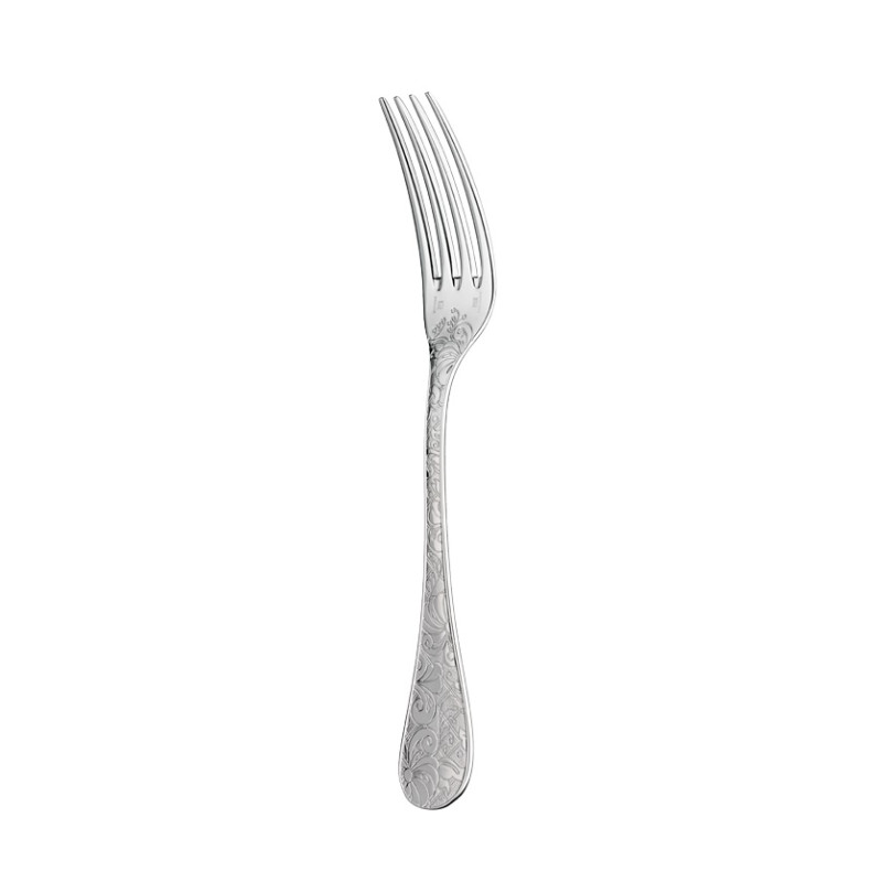 Christofle Jardin D'Eden Plated Dessert Fork The silver plated dessert fork in the Jardin D’Eden pattern can be paired with the dessert spoon and knife to be used with desserts, salads or starters. The intricate verdant pattern by designer Marcel Wanders is characterized by interlacing vines, plants and flowers and named after the most famous garden in history. Jardin d'Eden is the latest Christofle flatware, designed by Marcel W&ers. The pattern is poetry made real. The effulgent decoration spans the entirety of the flatware in a single engraving. The interlaced leaves, flowers & curls are inspired by a lush garden, a fine tracery dancing over each Piece. MATERIAL • Silver Plated DIMENSIONS • : 17 cm