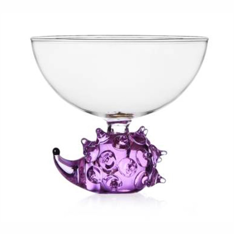 The cup from Ichendorf Milano's Animal Farm collection, designed by Alessandra Baldereschi, is made from clear borosilicate glass in a purple color. Each piece is handmade and lampworked, featuring a refined design and exceptional artisanal craftsmanship.