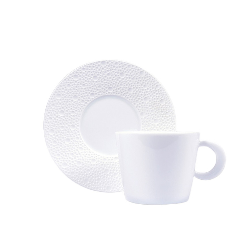 DISCOVER THE COLLECTION: Ecume by Bernardaud TEA CUP WITH SAUCER, ECUME 0733/20454 - BERNARDAUD LIMOGES The Ecume line by Bernardaud is an elegant and sophisticated option for those seeking high-quality porcelain for their table. Characterized by a modern and minimalist design, the Ecume line stands out for its unique texture, with shapes reminiscent of bubbles. Each piece is handmade by Bernardaud's master craftsmen, using traditional techniques to ensure maximum quality and durability over time. Available in various shapes and sizes, the Ecume line is perfect for creating refined and chic tables suitable for any occasion. Add a touch of class to your home with the Ecume line by Bernardaud. Material: porcelain Capacity: 17 cl SKU: 073320454