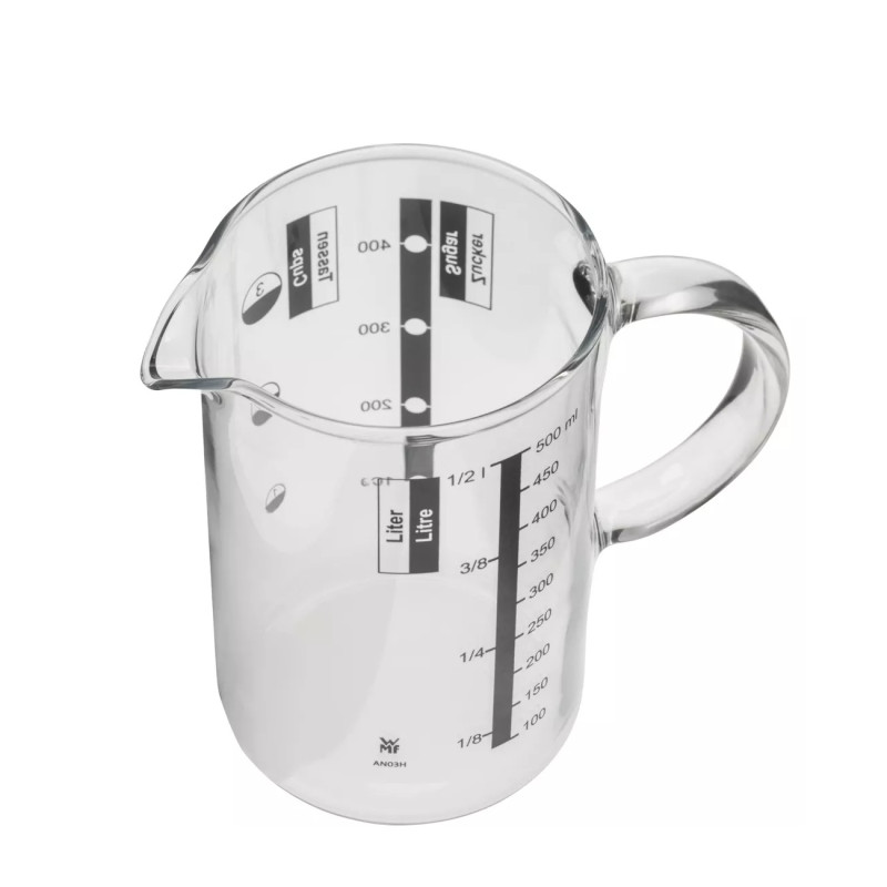 GLASS MEASURING CUP 0.5 LT, 06.0596.2000 - WMF 0.5 L glass measuring cup SKU: 0605962000 Material: Heat-resistant glass measuring cup Measurement scale indicated in liters, milliliters, cups, and grams. Measures small quantities and liquids without a scale. Dishwasher safe.