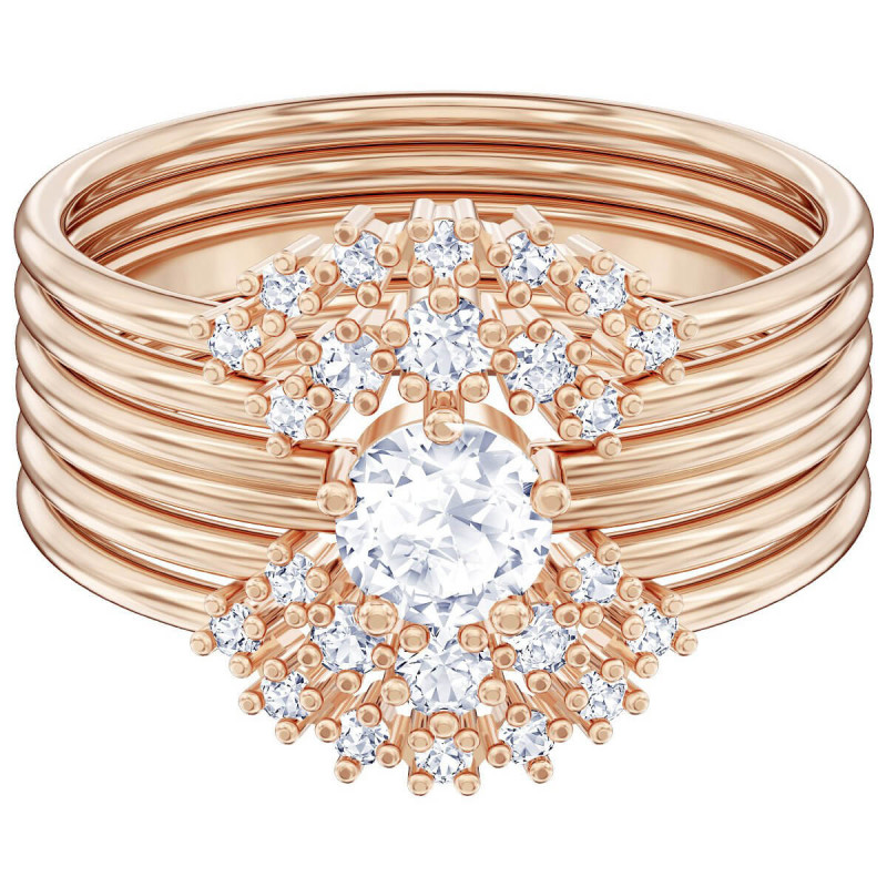 Questo anello a fasce di grande stile è decorato con gruppi di delicati cristalli bianchi con incastonatura a griffe, scintillanti come le stelle, e presenta un grande elemento di cristallo centrale. Un design moderno e versatile, puoi riordinare gli anelli come desideri per creare look differenti o indossarli su dita diverse. Colore: Bianco Materiale: Placcato color oro rosa / Rodio