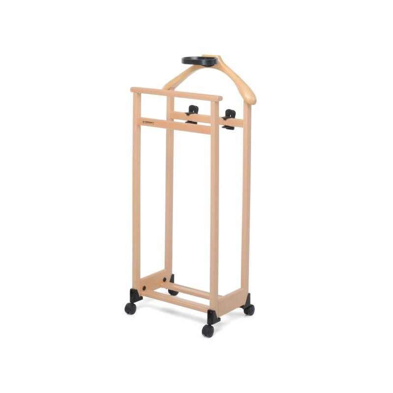 L'INDOSSATORE - FOPPA PEDRETTI Indossatore in legno massiccio verniciato trasparente dotato di spalla porta giacche e camicie, barra per pantaloni, pinza porta gonne, base per scarpe e vaschetta porta oggetti.Facilmente spostabile grazie alle quattro ruote piroettanti. Dimensioni in cm: (altezza, profondità, larghezza) 103 x 27 x 46 cm