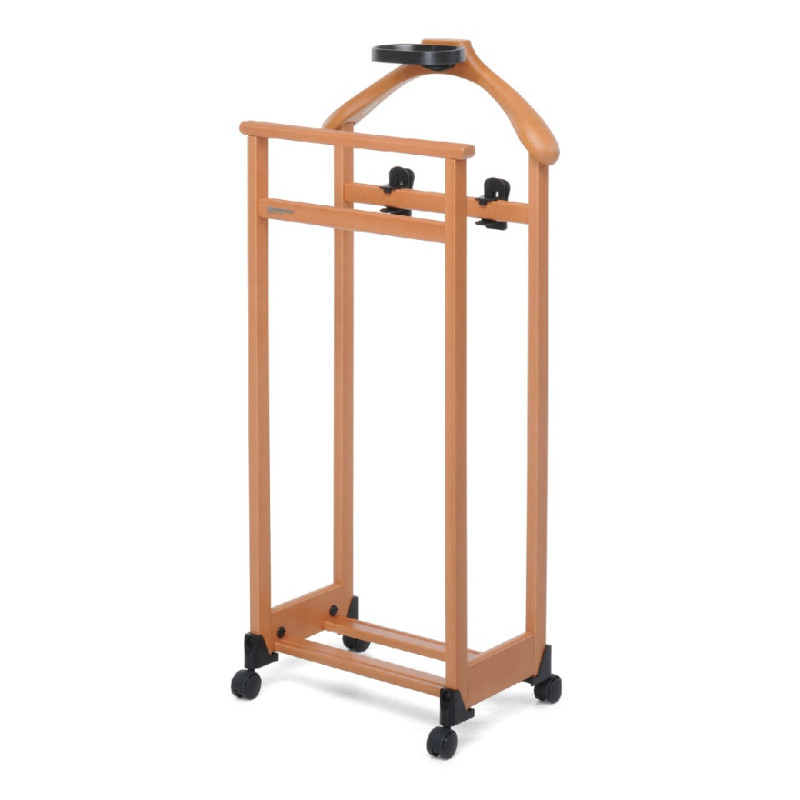 L'INDOSSATORE - FOPPA PEDRETTI Indossatore in legno massiccio verniciato trasparente dotato di spalla porta giacche e camicie, barra per pantaloni, pinza porta gonne, base per scarpe e vaschetta porta oggetti.Facilmente spostabile grazie alle quattro ruote piroettanti. Dimensioni in cm: (altezza, profondità, larghezza) 103 x 27 x 46 cm