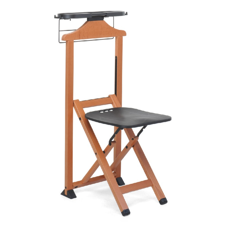 L'indossatore pieghevole in legno Suite di Foppapedretti include una comoda sedia con sedile anatomico, vaschetta porta oggetti, doppia staffa porta pantaloni, ganci per cinture e cravatte, spalla per giacche e camicie. La struttura è in legno massiccio di faggio verniciato color noce, con piedini antisdrucciolo in gomma. Quando è chiuso, occupa poco spazio e resta in piedi da solo.