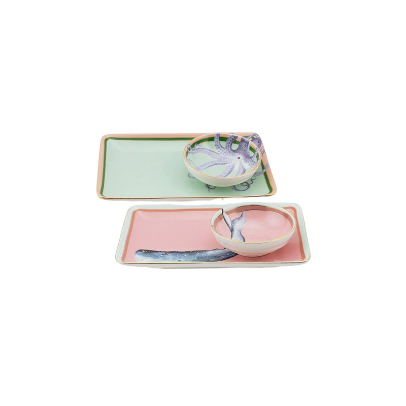 SET DI 2 VASSOI SUSHI CON COPPETTE, A22010014 - YVONNE ELLEN Il set sushi firmato Yvonne Ellen è composto da pregiata porcellana inglese e contiene due piatti da sushi, due ciotole per la salsa soia e due coppie di bacchette, il tutto disegnato con la presenza di una adorabile balena e un divertente polpo. Sku: A22010014