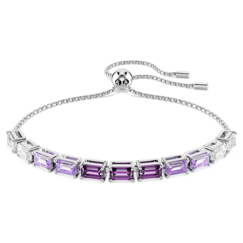 Il talento creativo di Swarovski risplende in questo bracciale luminoso e raffinato. Caratterizzato da una chiusura scorrevole, il design placcato rodio è decorato con una fila di Swarovski Zirconia taglio Octagon Step, ciascuna con montatura a griffe e sfumature che vanno dal trasparente al viola intenso.