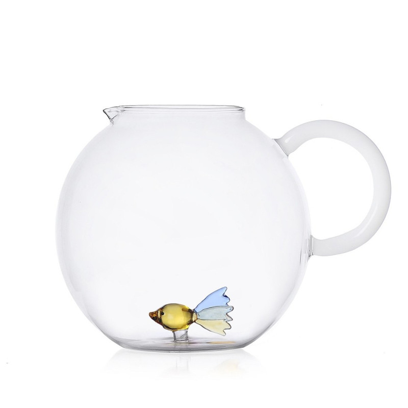 Collezione Animal farm Design Alessandra Baldereschi Colore Clear Azzurro Giallo Materiale Borosilicato Manifattura Fatto a mano e modellato a lume Dimensioni H. 16.5 D. 17 L. 21,0 Lavaggio Lavabile in lavastoviglie a basse temperature (consigliati 40°).