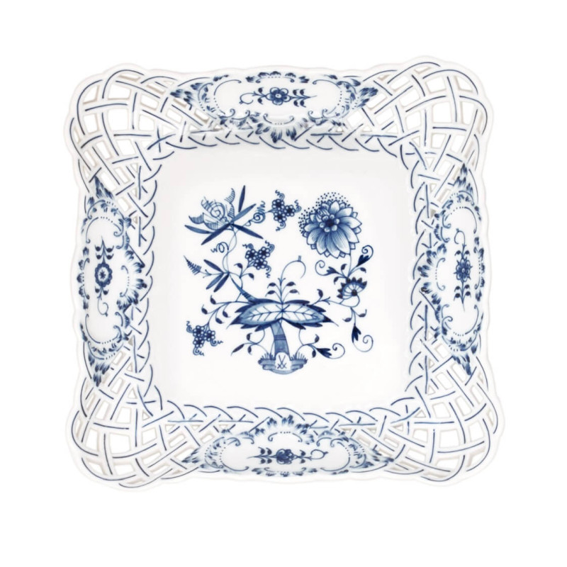 Produttore: Manifattura Porcellane di Stato Meissen Collezione: Nuovo Ritaglio, decoro Cipolla Blu Il decoro blu cobalto su porcellana bianca è stato ispirato da i decori dell' Asia orientale. Articolo: Piatto traforato Codice : 54905/800101 Dimensioni: 24 x 24 cm Manutenzione: adatto alla lavastoviglie.