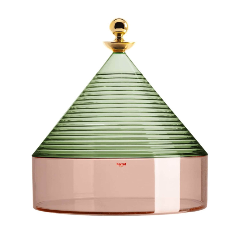 SOPRAMMOBILE CONTENITORE TRULLO, 1550 - KARTELL Trullo Kartell è un contenitore per la tavola con un coperchio a forma conica, che trae ispirazione dalle architetture delle case ad Alberobello. Fabio Novembre prosegue il suo percorso creativo influenzato dall'architettura della sua terra natale, la Puglia. Dopo il successo di Piazza, il vassoio che riproduce in scala le superfici e le geometrie delle piazze di Lecce, Novembre presenta i contenitori Trullo. Questi sono disponibili in diverse combinazioni di colore, come cristallo/fumé, verde salvia/rosa, fumé/verde e giallo/blu. Materiale : Tecnopolimero Dimensioni : Ø 25 x H 27 cm