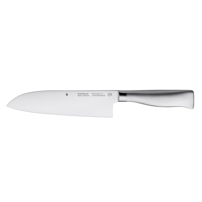 COLTELLO SANTOKU 18CM, GRAN GOURMET, 18.9194.6032 - WMF Il coltello WMF Grand Gourmet Santoku è un coltello da cucina di alta qualità che presenta una lama di 18 cm forgiata a mano realizzata in acciaio resistente alla corrosione e all'acido. Il coltello è progettato con la tecnologia di taglio Performance per una durata a lunga durata e affilatura, e presenta un design equilibrato con manici ergonomici e protezione delle dita per un uso sicuro.